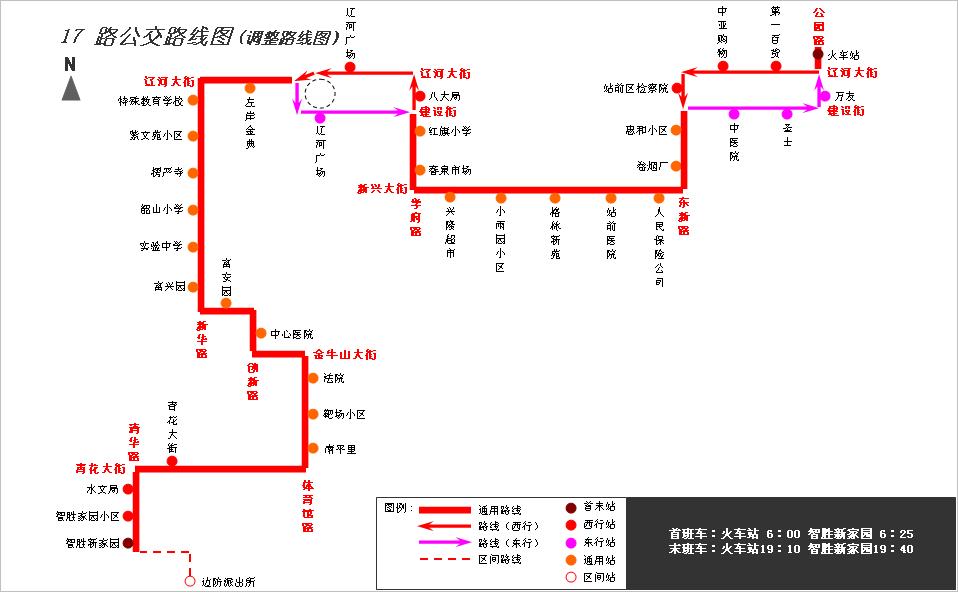 停用17路東風(fēng)路沿線“公汽公司”、“大潤發(fā)超市”及“人民保險(xiǎn)公司”站位;新華路沿線“紫竹院小區(qū)”雙向站位,“鑫牛市場”西行站位;小循環(huán)路段“市委黨?!?、“信訪局”西行站位,“鑫牛市場”、“靶場小區(qū)”東行站位;